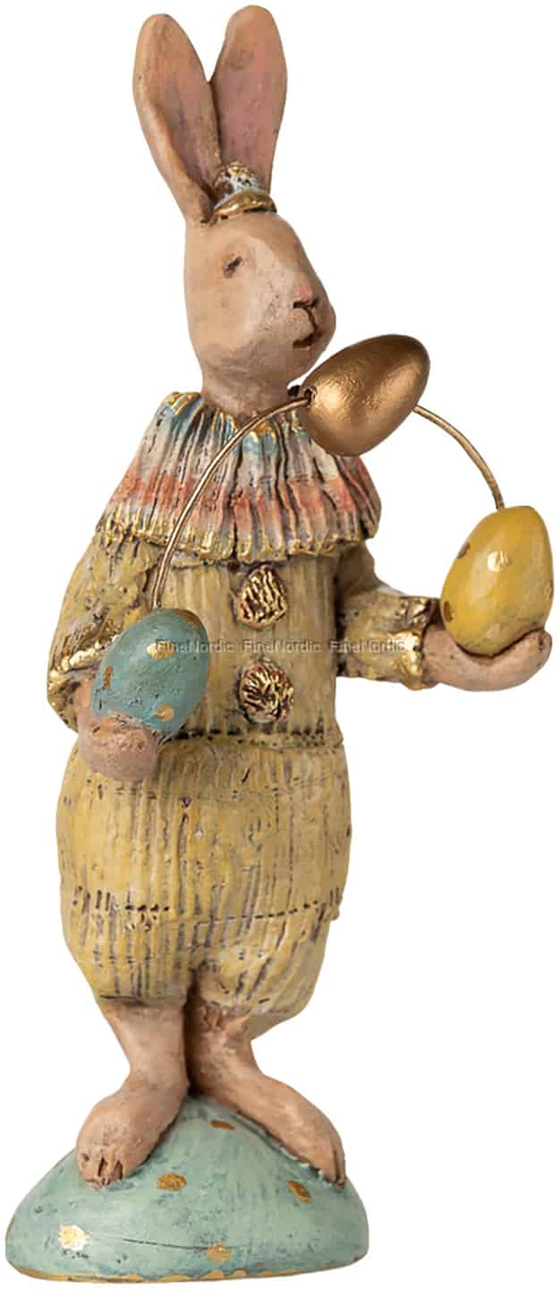 Fra Mailegs fantasifulle verden kommer en karakter fylt med vårens stille magi. Påskeparade nr. 27 er et mesterverk av sart historiefortelling, fra den lille gullkronen på hodet til den nøye gjengitte teksturen i det sennepsgule kostymet. Legg merke til den delikate, håndmalte rysjekragen rundt halsen og det skimrende bladgullet som fanger lyset på hvert av de tre eggene den så forsiktig balanserer. Dette er mer enn en dekorasjon; det er en personlighet som venter på å bli en del av familiens historie.