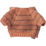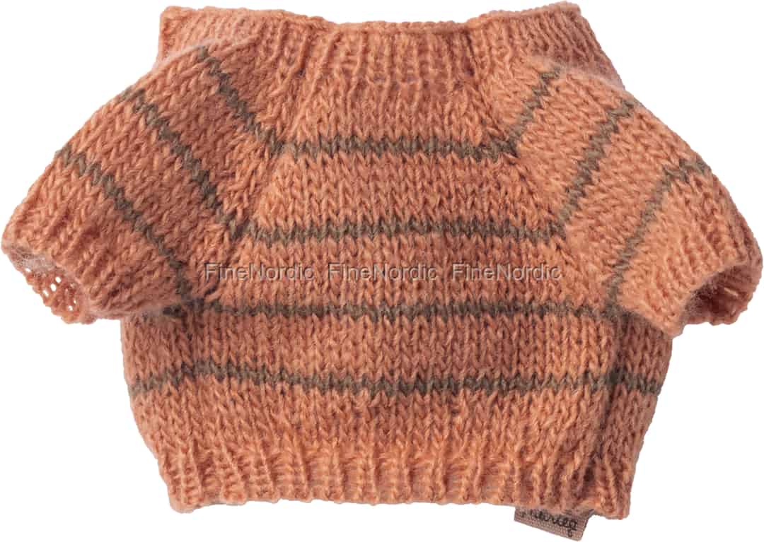 Det finnes en spesiell magi i de små detaljene som vekker fantasiverdener til live. Med denne sjarmerende strikkegenseren kan den lille kle på sin kjære Maileg-valp for en tur i en tenkt park eller en rolig ettermiddagsfortelling foran peisen. Den myke strikken med tekstur føles herlig å ta på, og den enkle handlingen å trekke genseren over hodet på valpen blir et ømt øyeblikk av omsorg som nærer empati og fortellerglede. Den varme korallfargen, fremhevet av myke grå striper, tilfører et hint av mild farge til samlingen og tenner gnisten til nye fortellinger og eventyr.