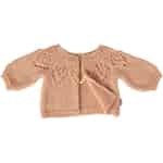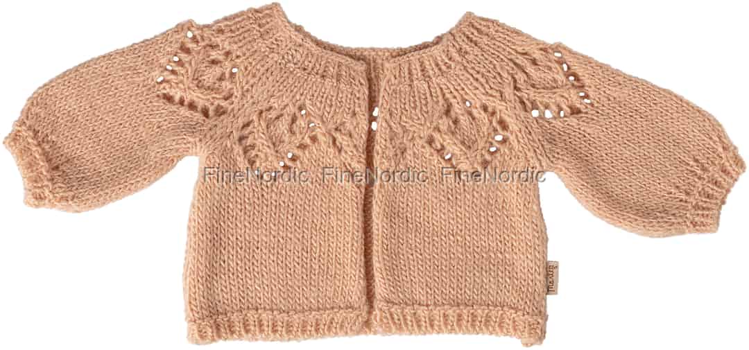 Hver detalj på denne Maileg-cardiganen er designet for å inspirere til historier. Det myke, lyserosa strikkestoffet føles vidunderlig mykt, og det intrikate hullmønsteret over skuldrene viser det gjennomtenkte håndverket Maileg er kjent for. De sjarmerende puffermene og den klassiske vrangborden skaper en tidløs silhuett som forvandler et enkelt antrekk til noe helt spesielt. Det er et plagg som inviterer deg til å senke tempoet og sette pris på de små, vakre detaljene som vekker fantasiverdener til live.