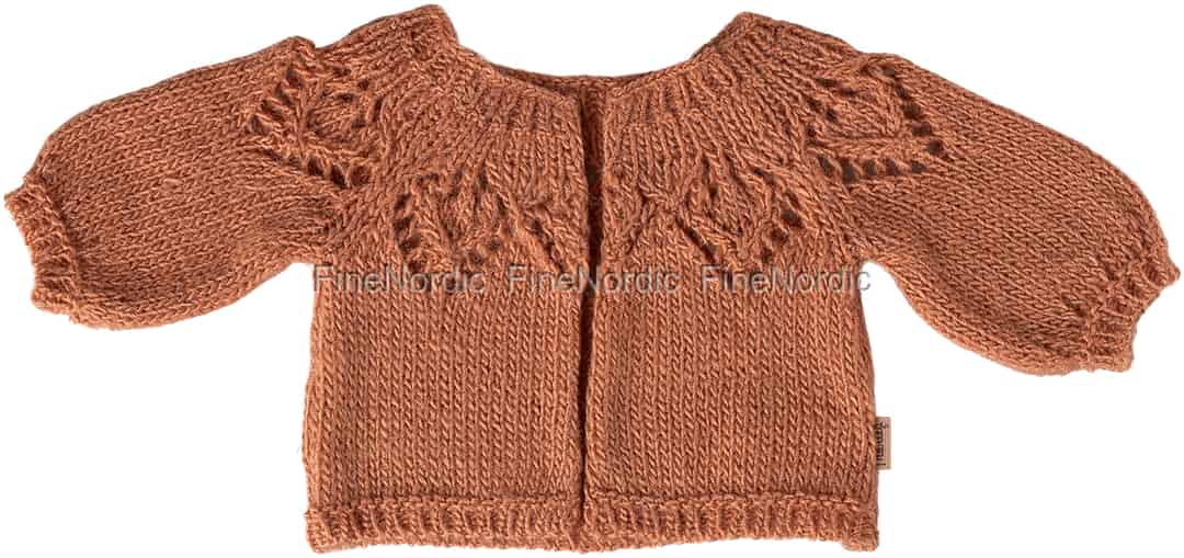 Enhver kjær Maileg-venn fortjener en garderobe fylt med plagg som er like spesielle som dem selv. Denne lille cardiganen er et vakkert eksempel på Mailegs øye for detaljer, designet for å inspirere til utallige historier. Den varme, gammelrosa fargen bringer tankene til høstturer og koselige ettermiddager, mens det utsøkte strikkemønsteret rundt skuldrene vitner om et håndverk som får det lille plagget til å føles helt ekte. Det er mer enn bare et tilbehør; det er en invitasjon til å vise omsorg for en venn.
