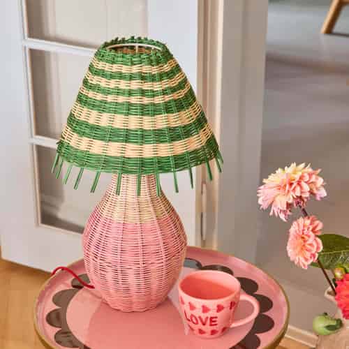 Rice Rattan bordlampe - Rosastripet - E27-sokkel og 2-pins støpsel - Høy