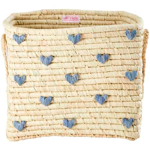 Rice Raffia Kurv - Kvadratisk - Raffiahåndtak - Blå Hjerter