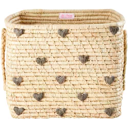 Rice Raffia Kurv - Kvadratisk - Raffiahåndtak - Mørkegrå Hjerter