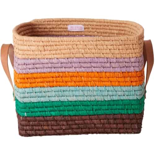 Rice Raffia Kurv - Kvadratisk - Lærhåndtak - Striper - 'Follow The Call of The Disco Ball' Farger