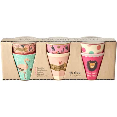 Rice Melamin Barnekopper - Jungel Dyr - Rosa - Liten - Sett med 6 i Gaveeske