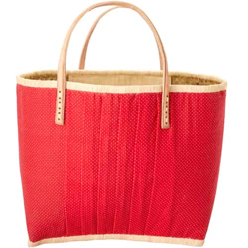Rice Raffia Shoppingveske - Stoffdekket - Lærhåndtak - Rød - White Dots - Medium