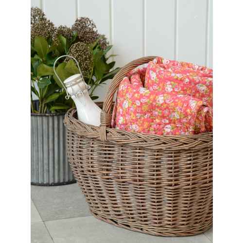 Rice Raffia Shoppingveske - Stoffdekket - Lærhåndtak - Light Blue Check - Stor På lager