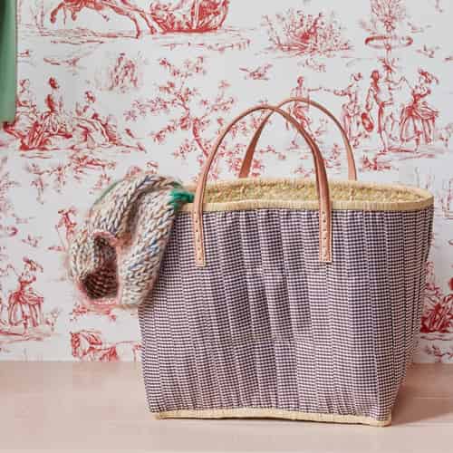 Rice Raffia Shopperveske - Stoffdekket - Lærhåndtak - Brun Vichy - Stor Utgått