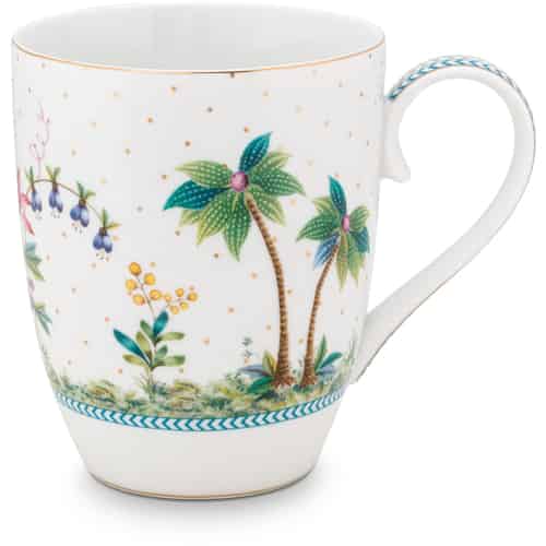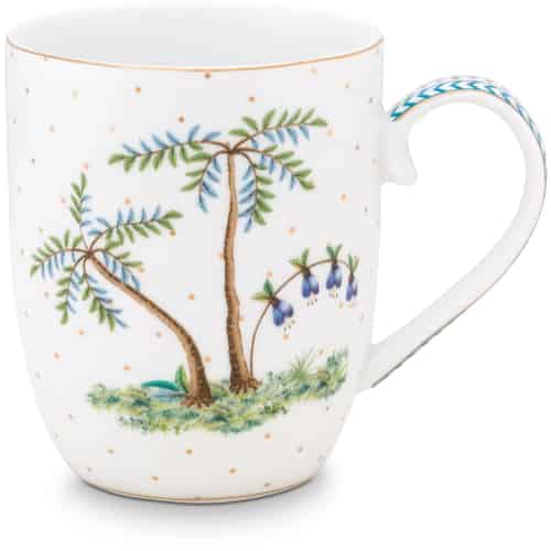 Her finner du en porselensskål med gyldne prikker på utsiden, gylden kant og fugl, trær og blomster på innsiden. Sjarmerende skåler dekorerer på bordet ditt. Pip Studio skål Jolie Flowers Dots Gold 15 cm, kjøp det online her. På engelsk kalles produktet "Bowl Jolie Flowers Dots Gold 15 cm", og det ble introdusert for første gang i sesongen "Pip Studio Home Collection Spring Summer 2021".