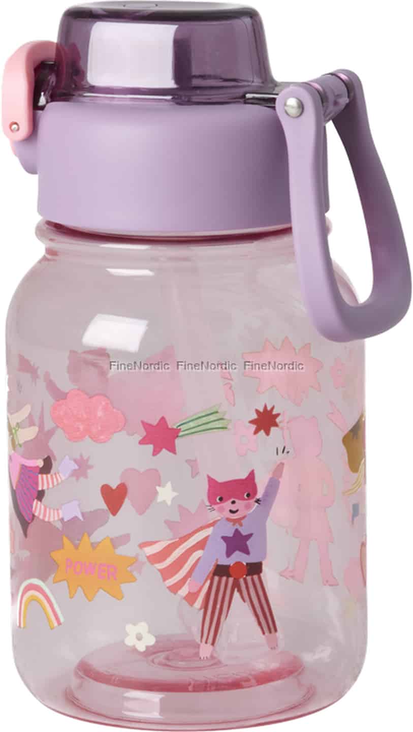 Hver dag byr på et nytt eventyr, og enhver liten helt trenger en trofast følgesvenn. Denne fantastiske drikkeflasken fra Rice er designet for å være akkurat det. Den gjennomsiktige rosa flasken er et lerret for en verden av moro, med en modig katte-superhelt, strålende regnbuer og styrkende stjerner som vil inspirere barnet ditt gjennom hvert øyeblikk av dagen. Det er en herlig måte å gjøre hydrering til en del av leken.