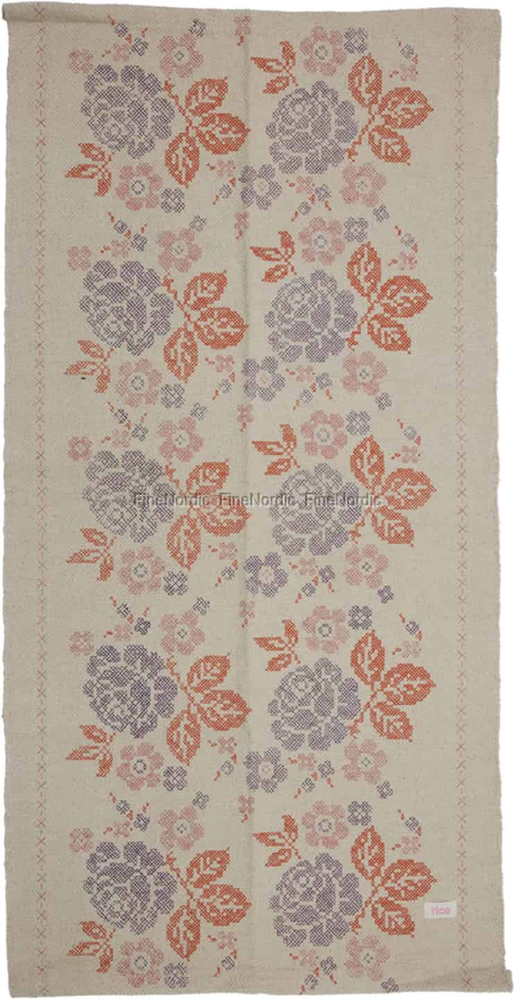 Fra våre venner i Rice er denne gulvløperen en hyllest til farger, komfort og den enkle skjønnheten i folkekunsten. Designet, som minner om intrikate korsstingsarbeider, forteller en historie om blomstrende hager og stille, kreative ettermiddager. Hver stiliserte rose og hvert blad, satt mot den naturlige sandfargede bomullen, skaper et mønster som er både nostalgisk og herlig moderne. Dette er ikke bare et teppe som dekker et gulv; det fyller rommet ditt med den karakteristiske, livsglade ånden som Rice er kjent for.