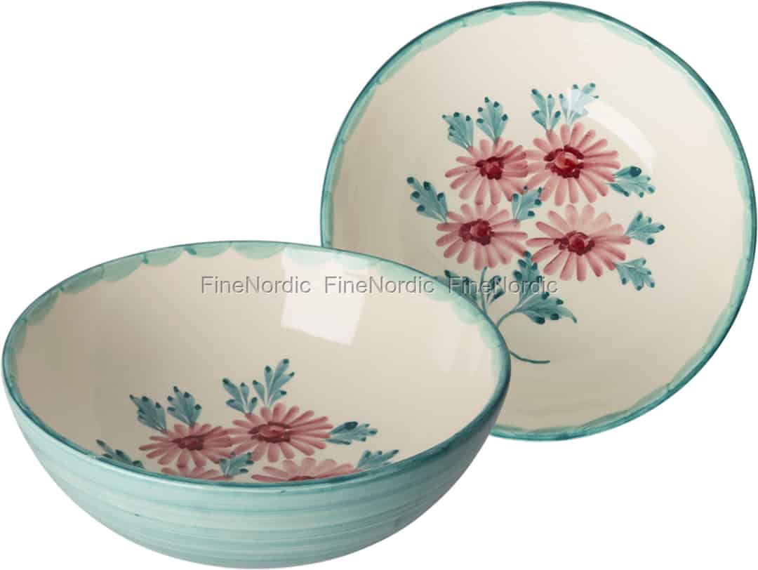 - Et unikt, håndmalt design: Hver skål har et herlig blomstermotiv, håndmalt i myk rosa og turkis, noe som sikrer at ditt eksemplar har sin helt unike, kunstneriske karakter.