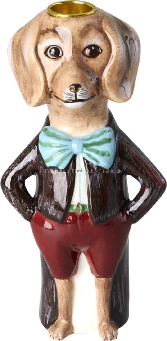 Møt den mest elegante hunden du noensinne vil invitere til bords. Med en selvsikker holdning og en sjarmerende sløyfe er denne herlige lysestaken mer enn bare pynt; den er en samtalestarter som bobler over av personlighet.