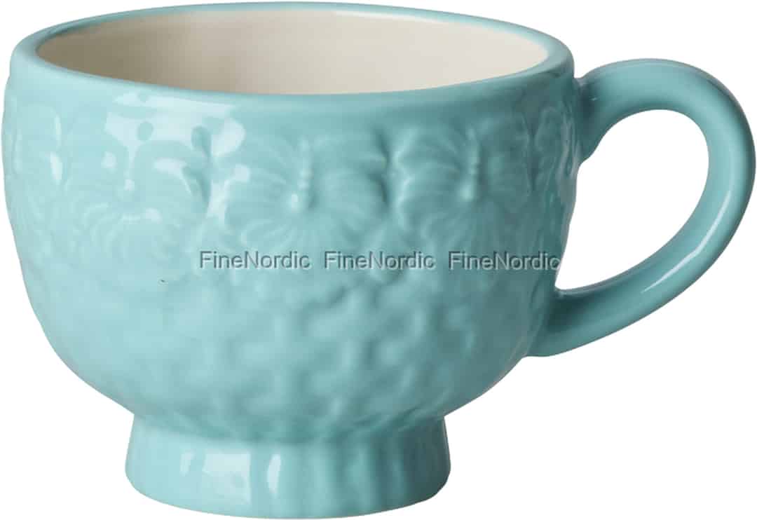 Se for deg at du varmer hendene rundt dette taktile, vakre kruset, mens den muntre mintfargen lyser opp morgenen din. De sjarmerende, pregede blomstene inviterer til et øyeblikk av stille nytelse, og forvandler den daglige kaffen eller teen til et lite, gledesfylt ritual.