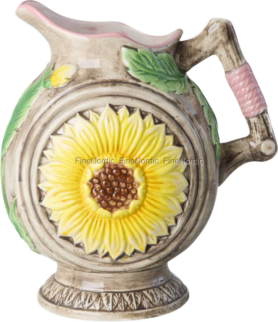 Feir den enkle, strålende gleden av en solsikke i full blomst. Denne herlig særpregede vasen fra Rice er en hyllest til solfylte dager og landlige hager, laget av keramikk med en rustikk, trelignende tekstur som er nydelig å ta på. Den store, pregede solsikken er vasens hjerte, og de livlige, gule kronbladene bringer umiddelbar glede til ethvert rom. Sjarmerende detaljer, som håndtaket formet som en kvist og det uventede innslaget av rosa, gir den en unik personlighet som er selve essensen av Rice. Det er en gjenstand som forteller en historie om varme og lykke.
