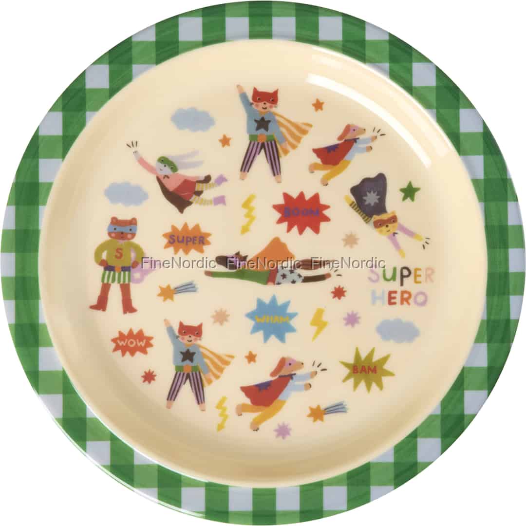 Med sin klassiske, grønne gingham-kant og et lyst, kremfarget senter, bringer denne tallerkenen fra Rice et snev av nostalgisk sjarm til kjøkkenet. Men ser du nærmere etter, utfolder det seg en hel verden av eventyr! Et helt team av dyre-superhelter – fra en katt med kappe til en flyvende hund – svever over overflaten, klare til å inspirere fortellinger om mot og moro. Den lekne grafikken med 'BOOM!' og 'WHAM!' gir en herlig tegneserie-energi som vil få den lille til å smile seg gjennom hvert måltid, og forvandle kresne spisere til entusiastiske deltakere.