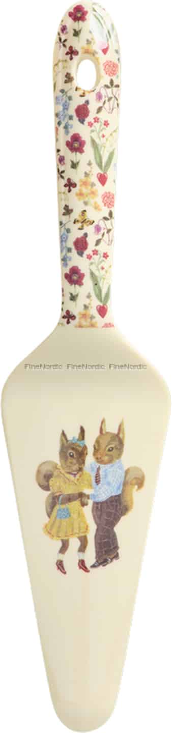 Se for deg å servere en nybakt kake, ikke bare med et redskap, men med et lite kunstverk. Denne vakre kakespaden, som er et resultat av et samarbeid mellom Rice og den anerkjente kunstneren Nathalie Lété, er skapt for nettopp det. Den kremfargede basen er det perfekte lerretet for en eventyrlig scene: to søte ekorn, kledd i sine fineste klær, som deler en dans. Det er et design som vekker fantasien og starter samtaler, og som forvandler en enkel dessert til midtpunktet i et godt minne.