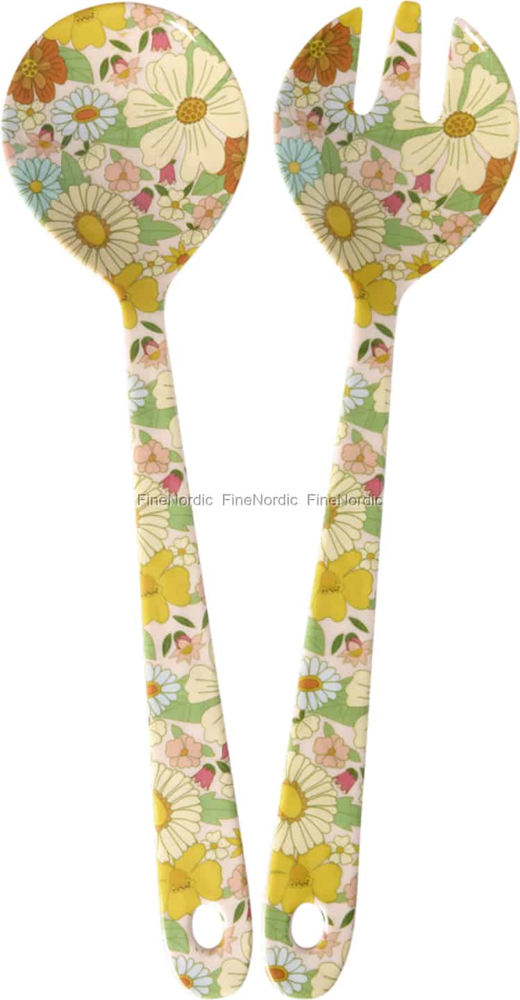 Rice er synonymt med hverdagsmagi, og dette 'Flower Power'-salatsettet er et perfekt uttrykk for den gledesfylte ånden. Hver skje og gaffel er prydet med en herlig eng av retroinspirerte blomster, som blomstrer i glade nyanser av gult, rosa og blått mot en myk kremfarget bakgrunn. Den blanke overflaten fanger lyset på en vakker måte, og forvandler en enkel bolle med grønt til et midtpunkt. Det er et design som ikke bare serverer mat; det serverer smil og oppmuntrer til gode samtaler rundt bordet.