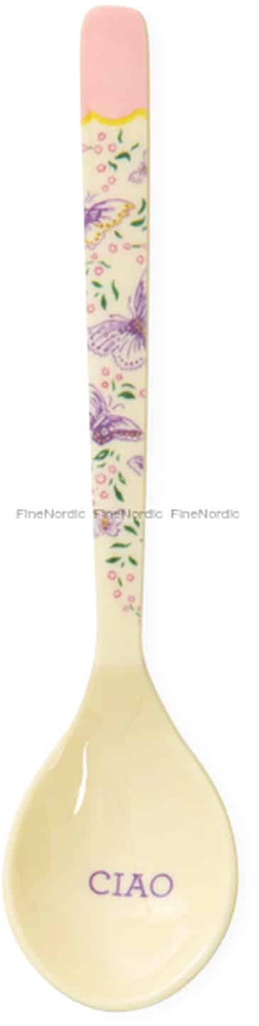 Se for deg å røre i morgenteen med en skje som føles som et lite stykke av en sommerhage. Denne sjarmerende melaminteskjeen fra Rice bringer et snev av finurlig skjønnhet til dine daglige ritualer, med sitt delikate sommerfugltrykk og en vennlig 'Ciao'-hilsen.