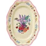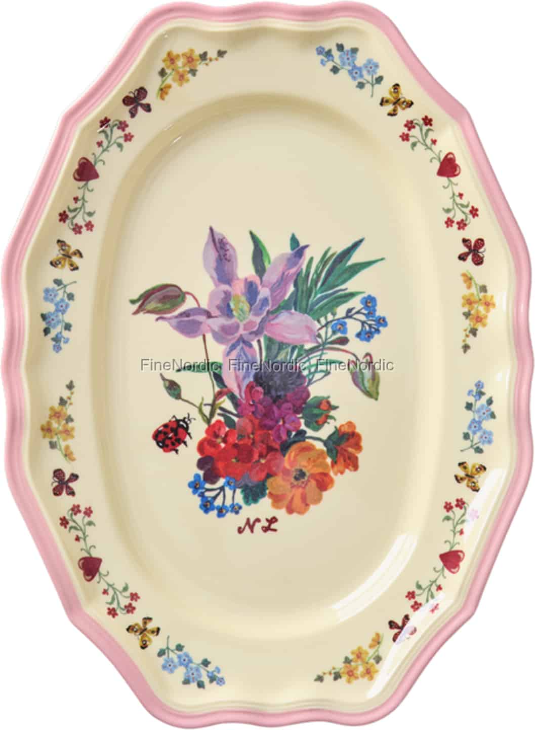 Se for deg en solfylt eng, levende med farger og sjarmerende småkryp. Dette er verdenen Nathalie Lété fanger på dette vakre serveringsfatet fra Rice. Hver detalj, fra den sentrale buketten til den lille marihønen og de flagrende sommerfuglene, er gjengitt i hennes karakteristiske eventyrlige stil. Den kremfargede basen fungerer som et perfekt lerret for de livlige blomstene, mens den myke, bølgete rosa kanten gir et siste preg av vintage-inspirert sødme. Det er mer enn bare et fat; det er et stykke funksjonell kunst som forteller en historie om glede og natur.