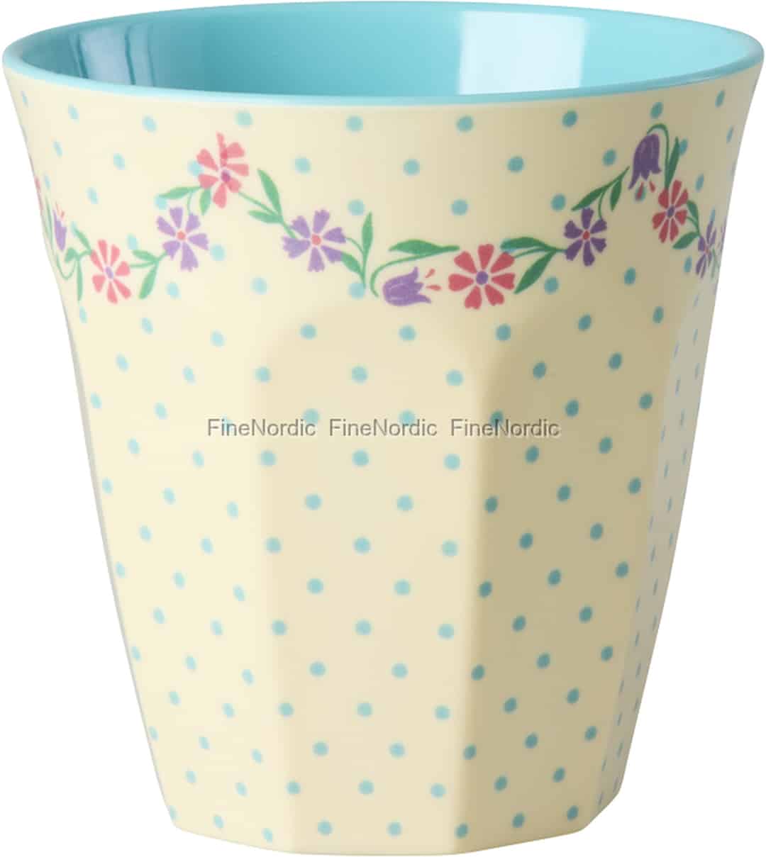 Forestill deg et snev av vårcharme, uansett årstid. Denne herlige melaminkoppen fra Rice bringer en leken glede inn i hverdagen med sin søte blomsterkrans og muntre prikker.