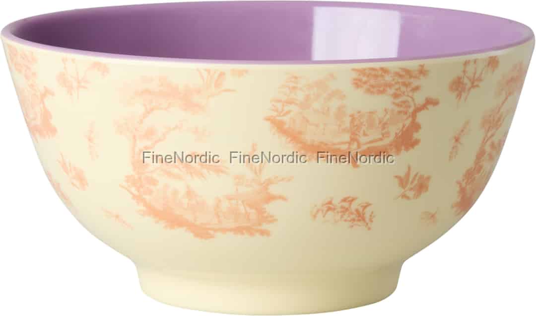 Innbyd et streif av pastoral romantikk til bordet med denne sjarmerende melaminskålen fra Rice. Det klassiske toile-mønsteret forteller en historie om idylliske landskap, mens en overraskende, livlig lillafarge på innsiden gir en gledesfylt og moderne vri.