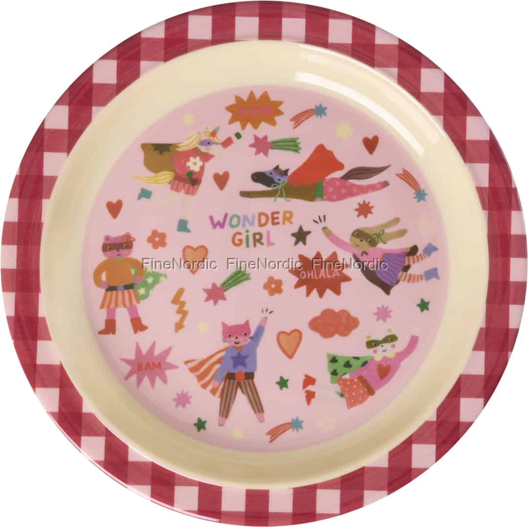 Fra det anerkjente danske merket Rice er denne "Hero"-tallerkenen mer enn bare et servise; den er en invitasjon til en verden av eventyr. Den glade, rødrutete kanten rammer inn en scene av ren glede, hvor hver karakter er klar for spenning. Se for deg at den lille peker ut sin favoritthelt og skaper historier om deres eskapader mens de nyter lunsjen sin. "Wonder Girl"-motivet feirer styrken og kreativiteten i hvert barn, og gjør selv en enkel matbit til en spesiell anledning.