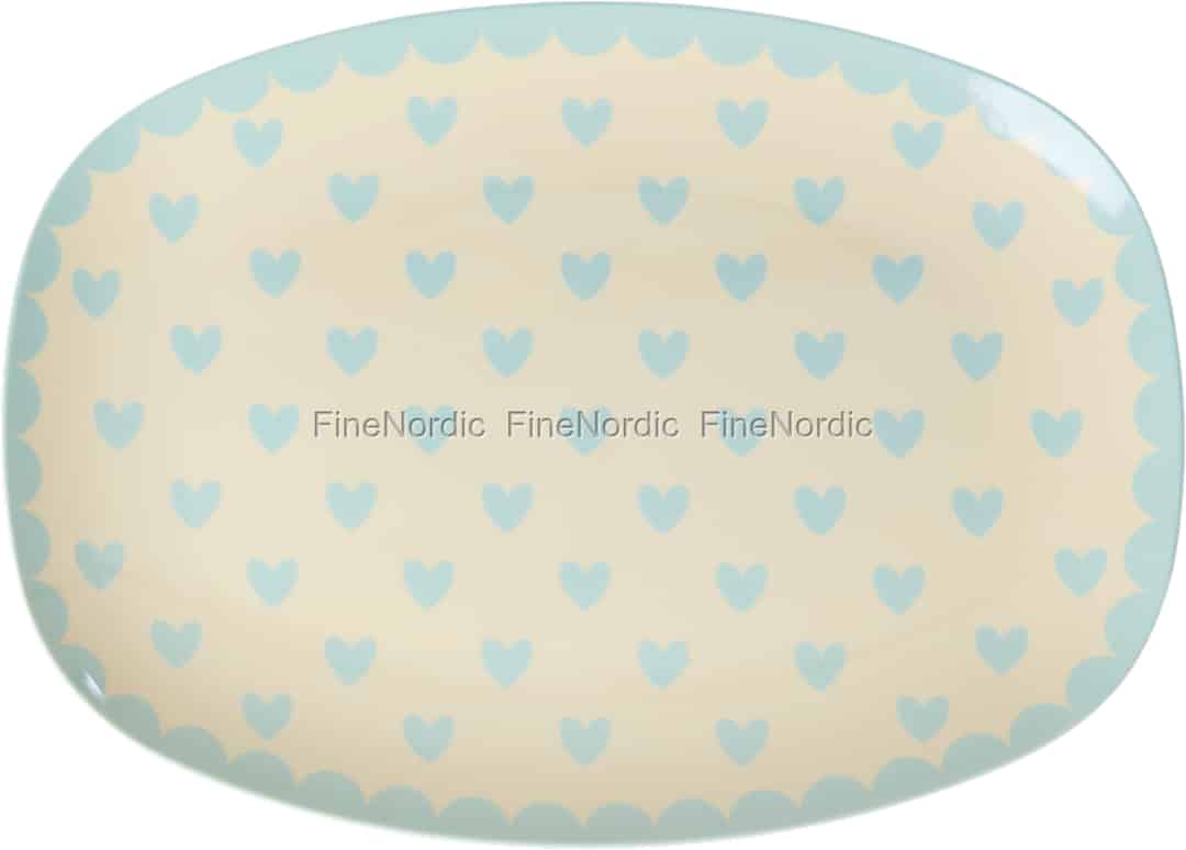 Forestill deg å tilføre et herlig innslag av farge og kjærlighet i hverdagen. Denne skjønne, rektangulære tallerkenen fra Rice, med sine søte mintfargede hjerter og bølgete kant, er skapt for å bringe et smil til hvert måltid.