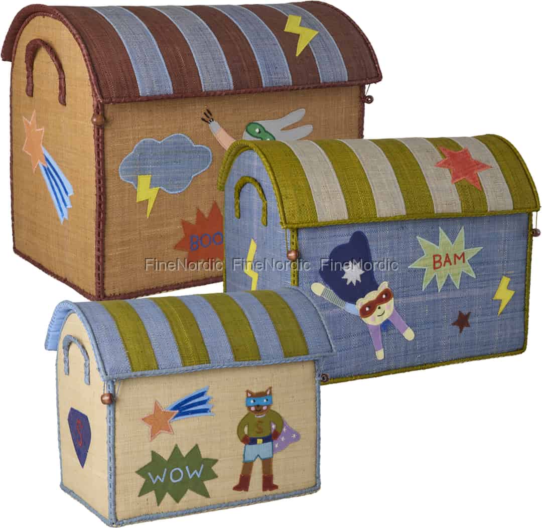 Se for deg et lekerom der rydding er en del av eventyret. Dette herlige settet med tre håndlagde raffiahus fra Rice bringer en verden av superheltmoro til organiseringen, og forvandler rot til dyrebare skatter.