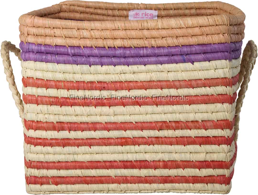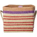 Oppdag den herlige verdenen til Rice, hvor hverdagslige gjenstander er fylt med farge og glede. Denne vakre, firkantede kurven er et perfekt eksempel, håndlaget med omhu av naturlige raffiafibre. Teksturen i flettingen er fantastisk taktil, mens de dristige stripene i rødt og lilla mot den naturlige basen skaper en munter rytme som umiddelbart lyser opp interiøret ditt. Dette er et produkt som forteller en historie om tradisjonelt håndverk, designet for å få deg til å smile hver gang du ser den.
