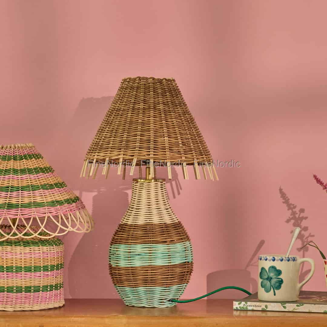 Denne høye bordlampen fra Rice er en hyllest til farger, tekstur og håndverk, og fanger den lekne ånden i dansk design. Hver lampe er kunstferdig vevd av naturlig raffia, noe som gir den en unik, håndlaget karakter som føles både autentisk og sjarmerende. Den vaseformede basen er et lerret for glade striper i jordnær brun, myk kremfarge og et forfriskende innslag av turkis, som tilfører interiøret ditt en følelse av varme og personlighet. Dette er et produkt som forteller en historie om kunstnerisk dyktighet og lykkelige øyeblikk.