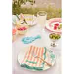 Se for deg en solfylt lunsj i hagen, der bordet bugner av fersk mat og hjertelig latter. Det er denne stemningen som er fanget i Rices vakre stofserviett. De klassiske oransje stripene gir en dose munter energi, mens den sjarmerende bølgekanten i en frisk turkisfarge tilfører et snev av leken eleganse som er selve essensen av Rice. Det er et design som føles både nostalgisk og herlig moderne, klar til å lyse opp enhver anledning, fra en enkel frokost til en spesiell feiring.