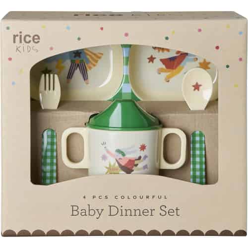 Rice Melamin spisesett for baby i gaveeske "Hero" grønn - Sett med 4 deler