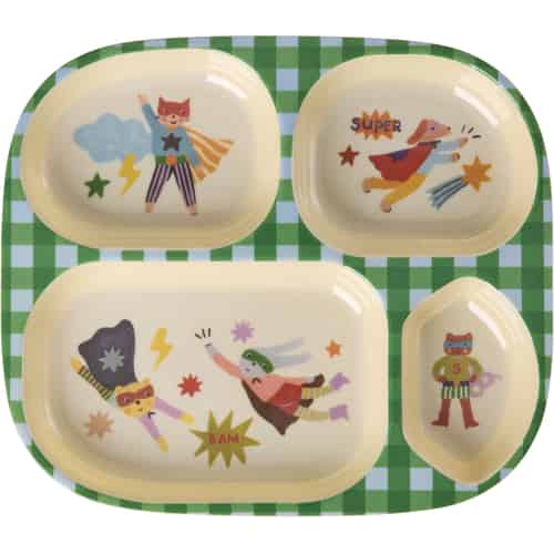 Rice Barnetallerken i melamin med 4 rom "Hero" - Grønn