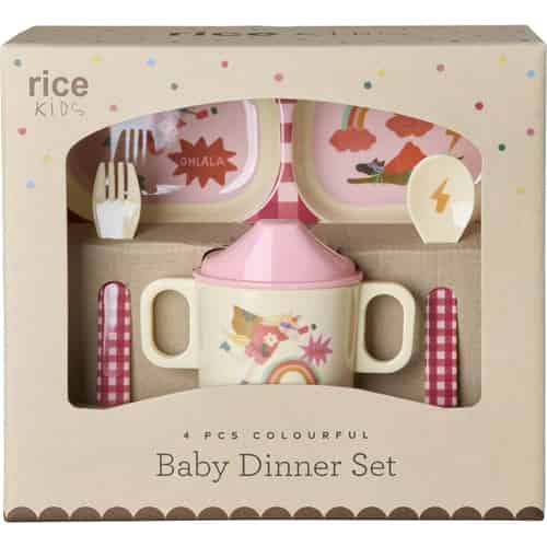 Rice Melamin spisesett for baby i gaveeske "Hero" Rosa - Sett med 4 deler